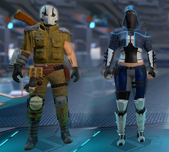 Aside from the new helmet, we’ve got two complete outfits! Bounty Hunter for the dudes and Assassin for the dudettes.