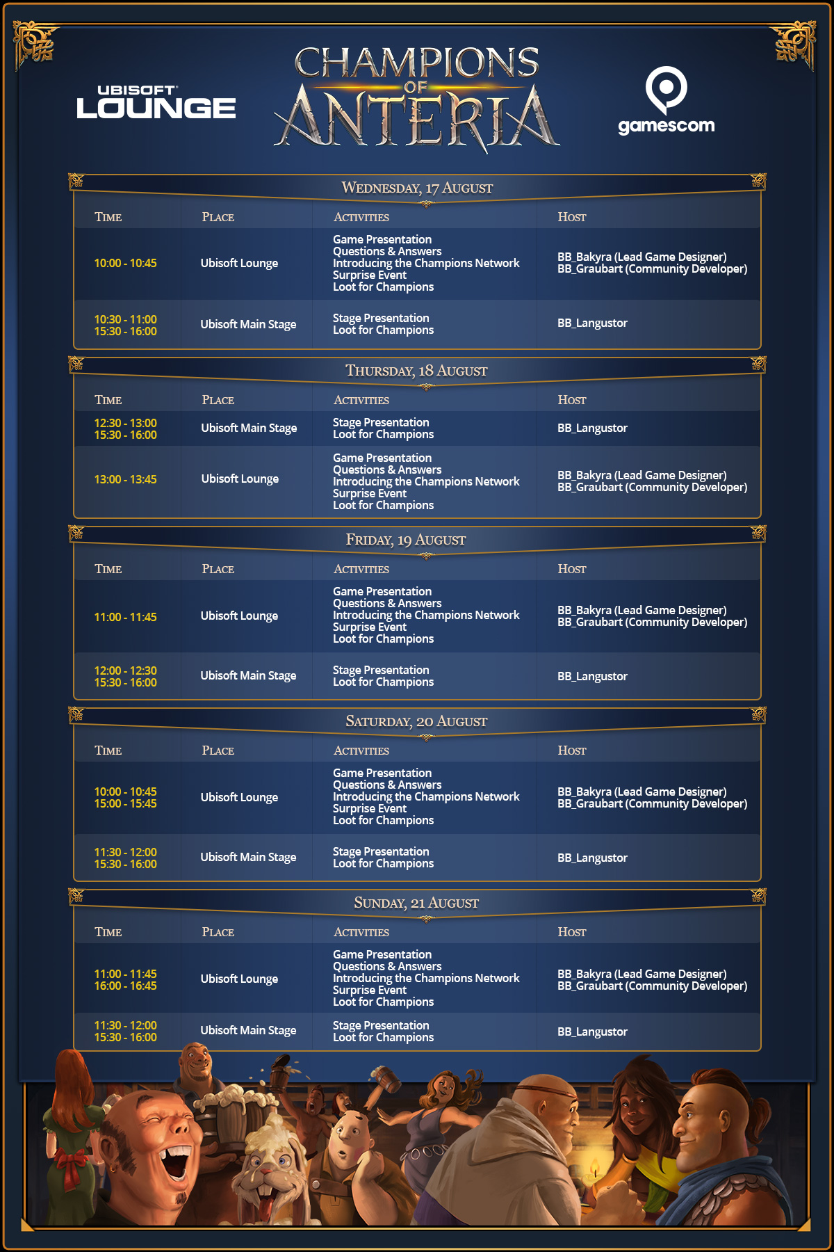 Thanks to all participants for an awesome gamescom 2016! The Champions of Anteria-Team wants to say thank you to all the adventurers that came to visit us in hall 6.1, both at our main stage and the comfortable Ubisoft Lounge. 17 sessions were all about Champions of Anteria. There were loads of information about the game, great questions and discussions, several surprises, T-shirts and metallic loot from Vargus