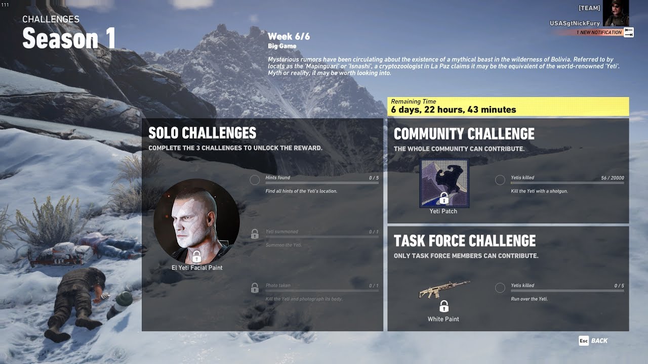What remains constant from my initial post is, you cannot receive the El Yeti Face Paint by simply killing El Yeti and photographing / interacting with his body. You never could. It was incidental on Season 1 Week 6 by completing the respective Solo Challenge 3.