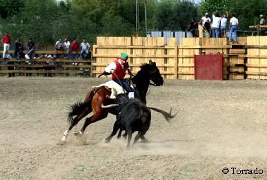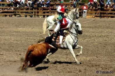 he was ridding MY horse "SANTANA" a 11 year old stallion of pure breed, and the horse KNOWS BEST then aproach a bull head on, so the horse veers to the side and makes a "cabriola" wich in turn leaves Mike the cowboy on his face in the mud with a charging bull coming to pay his respects