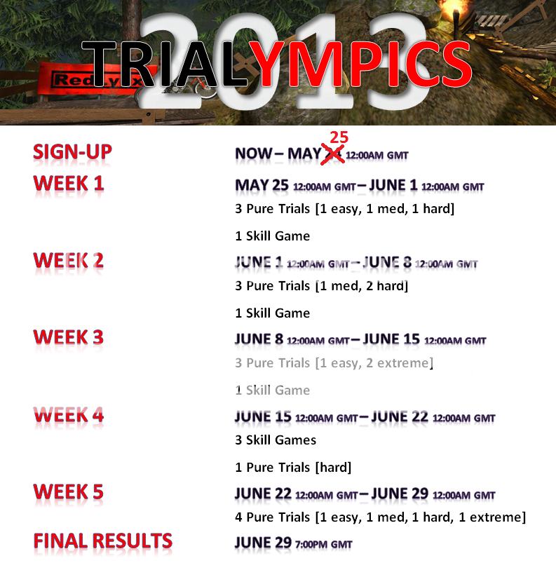 At the conclusion of week 2 the individual track/skill game leaderboards will be reviewed and anyone who literally beats the 1st, 2nd, or 3rd place rider in the group above them on at least 4 of the 8 events will be moved up. This does not mean, for instance, you beat the 1st place rider in the group ahead of you on one event, then the 2nd place rider on another event, then the 3rd place rider on 2 events. You MUST beat the SAME rider on 4 events. It does not matter if it is 2 skill games and 2 tracks or any other combination. There is no "fair" way to judge if someone has been placed in too high of a group so under no circumstance will someone be allowed to move down a group. If you have any questions regarding this rule please send me a PM.